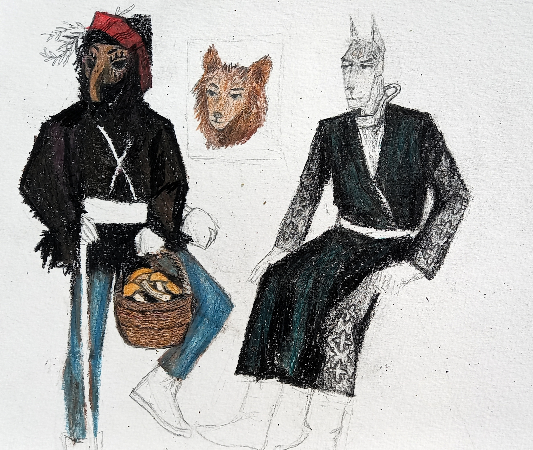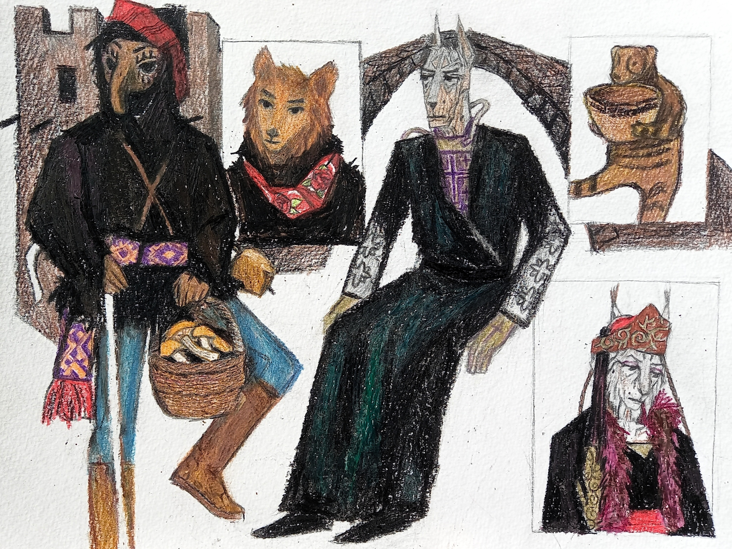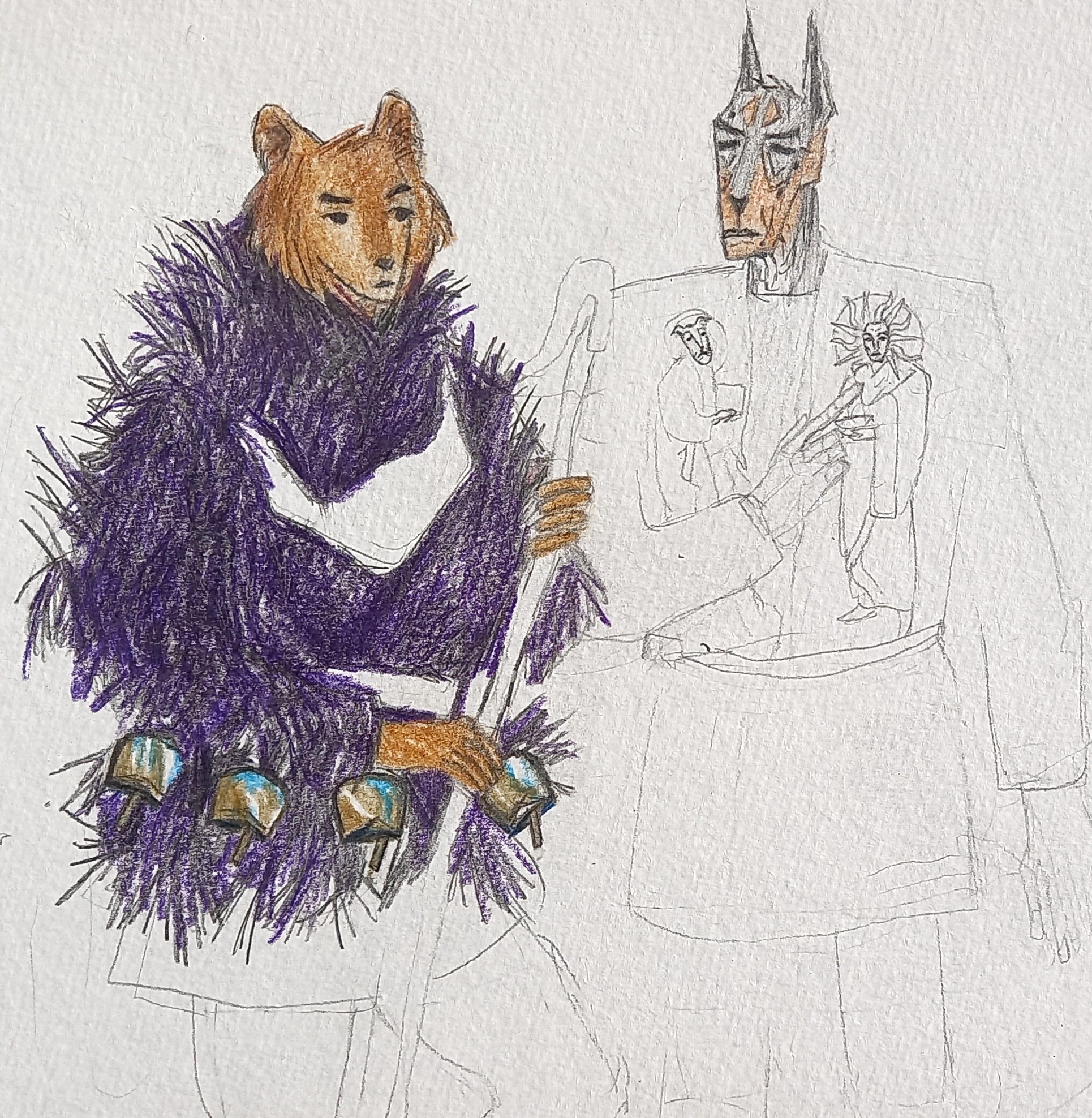 Her headwear is based on an 19th century greek bridal headpiece, while her outfit is inspired by christian vestments, that feature animals with byzantine halos instead of religious figures. The animals are holy in this universe and represent various things like Death (vulture), beauty (greek patridge), longetivity (greek tortoise) and resilience (wildgoat). The guys outfit is a mixture of byzantine and 19th century influences and he believes in a fictional christian-adjacent like religion