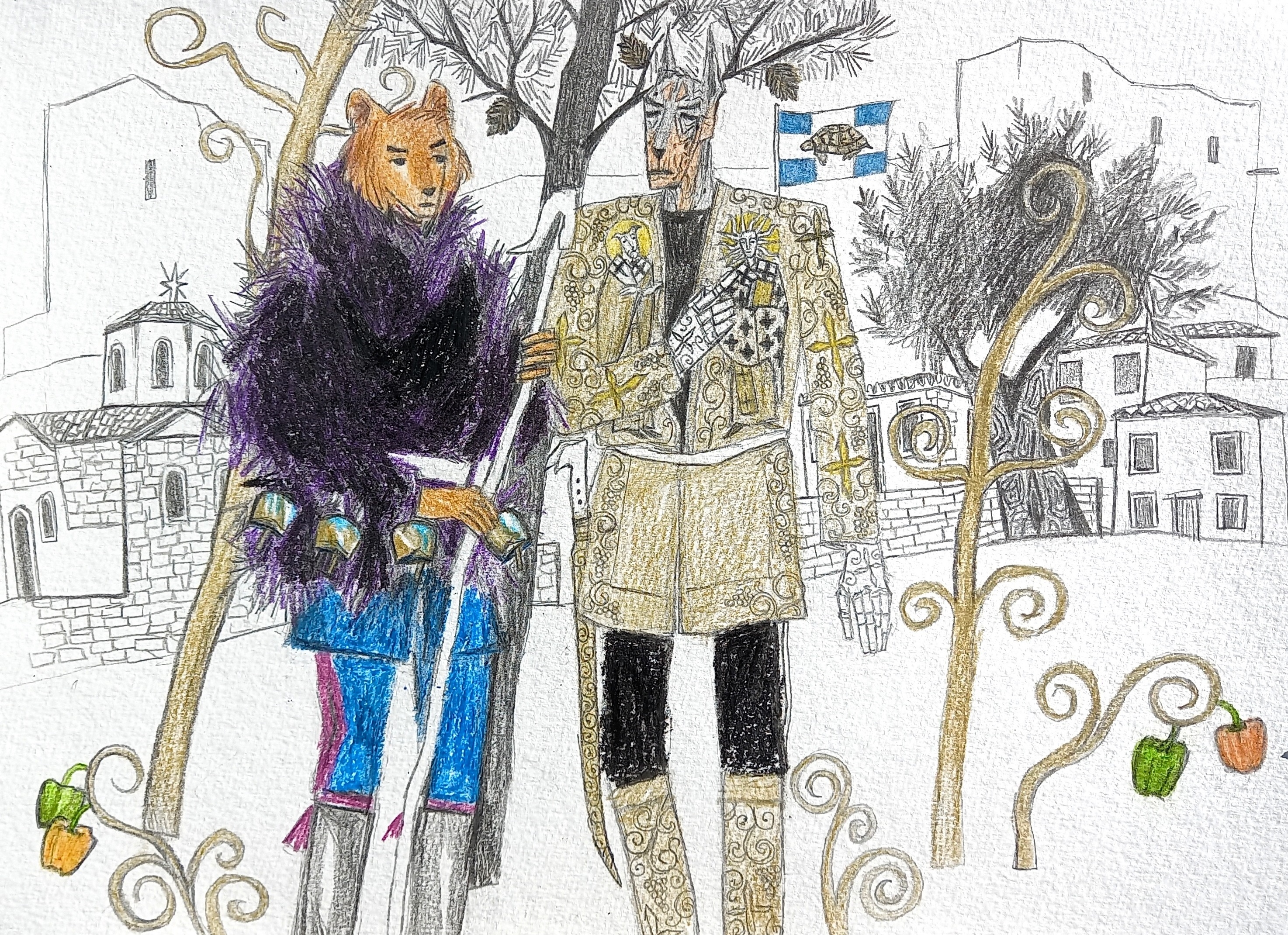 I did some changes to my previous ocs with this. I honestly dont know if i will ever continue my previous comic/universe to be honest and i just play with random ideas for now for fun. For the clothes i took some inspiration from the "Purpuris" costume for Lazaros. It is part of a northern greek christmas custom, where people dress with sheep/goat skin and wear this "mask" that is made of pumpkin (the custom has paganistic roots i believe and relates to celebrations of winter). Now for Kassandra, her headpiece is inspired by a headress worn by greek women from Kappadocia. Yiannis outfit, lastly, is not particularly interesting, he is wearing some form of vestments and probably some golden colored armor inside.